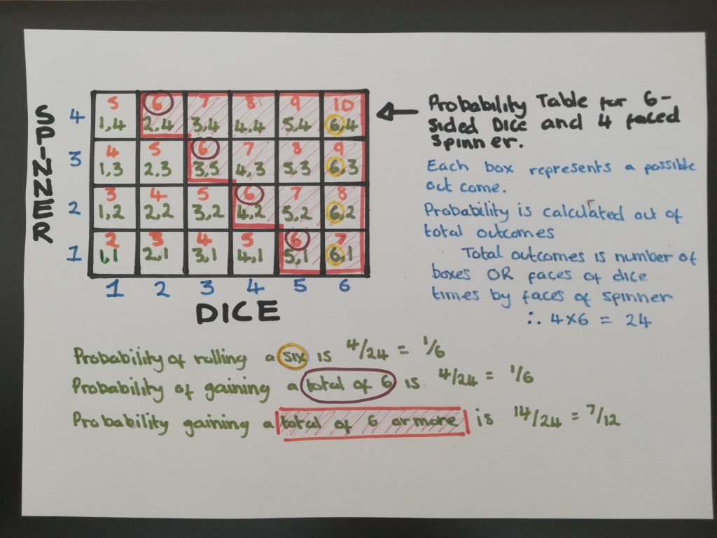 As the lesson was an introduction to probability, the first example included a spinner with numbers 1 to 4 and a dice with numbers 1 to 6. I explained what probability was then asked the student to copy and fill in a probability table with all the possible number combinations. I talked them through the process to ensure they conceptualised the information rather than just follow a procedure. I then asked the student to count how many probability combinations are available and explained that this in what all probabilities in this set of data will be out of. To work out how many times the number 6 will come up is the same as working out the probability of rolling a 6 out of the 24 different possible combinations.