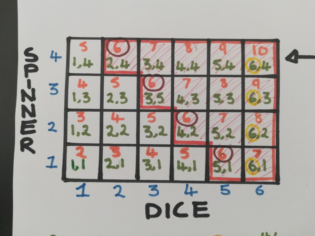 To help the student understand the possible totals of the number spun on a spinner and the number rolled on a dice, I asked the student to write the total of the various number combination on top (the numbers written in red on top of the co-ordinates in example below). The student was then asked to work out the probability for rolling and spinning a total of 6 which would be 4/24 simplified to 1/6. This was what the teacher had taught so far so I stopped my explanation here and asked the student to follow the same instructions for the other examples displayed on the board. I continued to sit with the student to ensure they understood the topic, then allowed them to work independently while I helped other students.